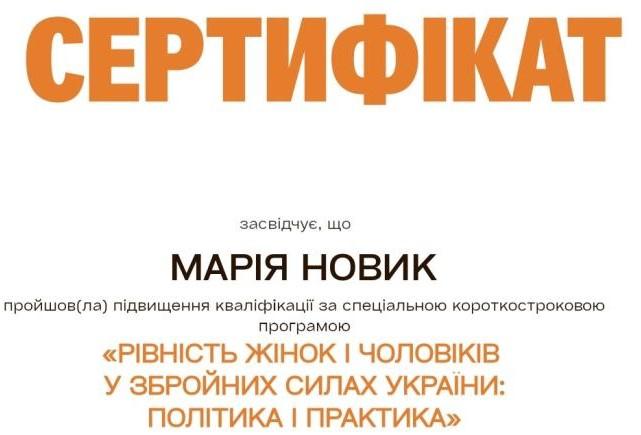 Завідувачка кафедри спеціальних поліцейських дисциплін та базової загальновійськової підготовки Сумської філії ХНУВС Оксана ПАНАСЮК і викладачка цієї ж кафедри Марія НОВИК пройшли онлайн-навчання за спеціальною програмою «Рівність жінок і чоловіків у Збройних Силах України: політика і практика».