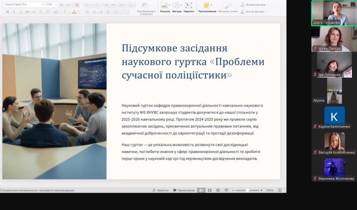 У межах тижня права в Україні відбулося спільне засідання наукових гуртків кафедри кримінального права та кримінології і кафедри кримінального процесу, криміналістики та експертології навчально-наукового інституту №5. Його провели керівники гуртків – доценти кафедр Ярослав ЛАНТІНОВ і Світлана ЛОЗОВА.