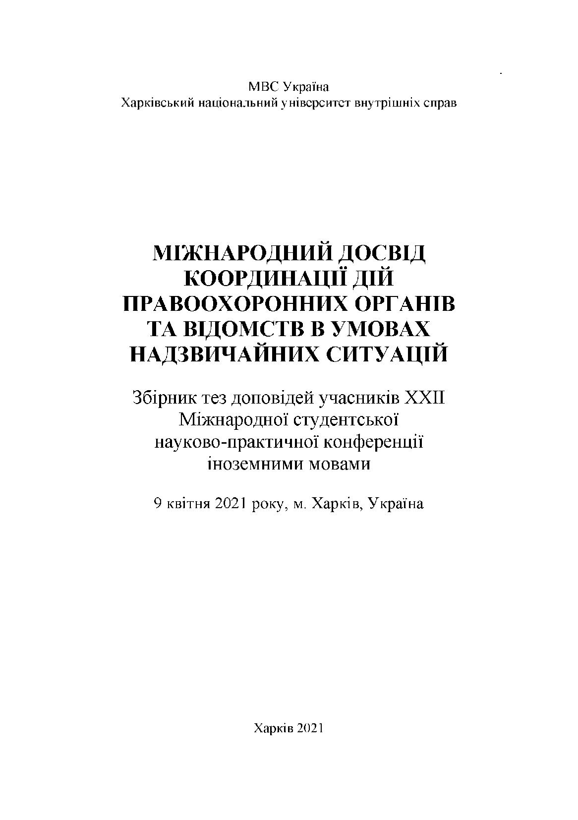 У Харківському національному університеті внутрішніх справ відбулася XXII Міжнародна студентська науково-практична конференція іноземними мовами «Міжнародний досвід координацій дій правоохоронних органів та відомств в умовах надзвичайних ситуацій» в режимі онлайн.