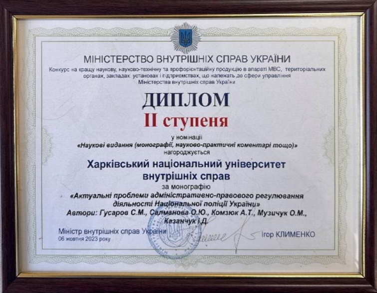 У 2023 році монографія «Актуальні проблеми адміністративно-правового регулювання діяльності Національної поліції України» [С.М. Гусаров, О.Ю. Салманова, А.Т. Комзюк, О.М. Музичук, І.Д. Казанчук] за заг. ред. доктора юридичних наук, професора С.М. Гусарова» за результатами щорічного конкурсу на кращу наукову, науково-технічну та профорієнтаційну продукцію в апараті МВС, територіальних органах, закладах, установах і на підприємствах, що належать до сфери управління МВС України нагороджено Дипломом ІІ ступеня у номінації «Наукові видання (монографія, науково-практичні коментарі тощо)».