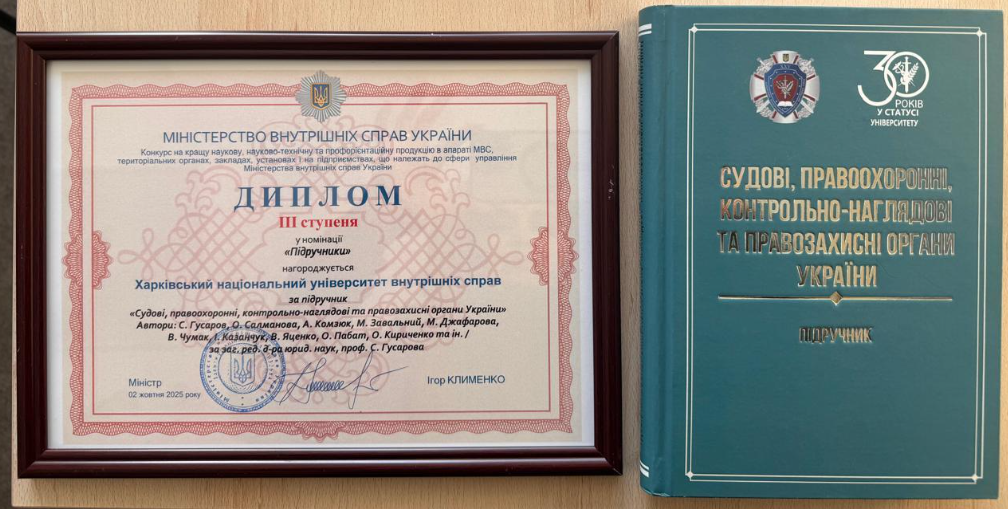 Також авторськими коллективами НПП кафедри видано підручник “Судові, правоохоронні, контрольно-наглядові та правозахисні органи України» 2-ге видання (2024) та навчальний посібник “Адміністративна відповідальність в Україні” (2025).