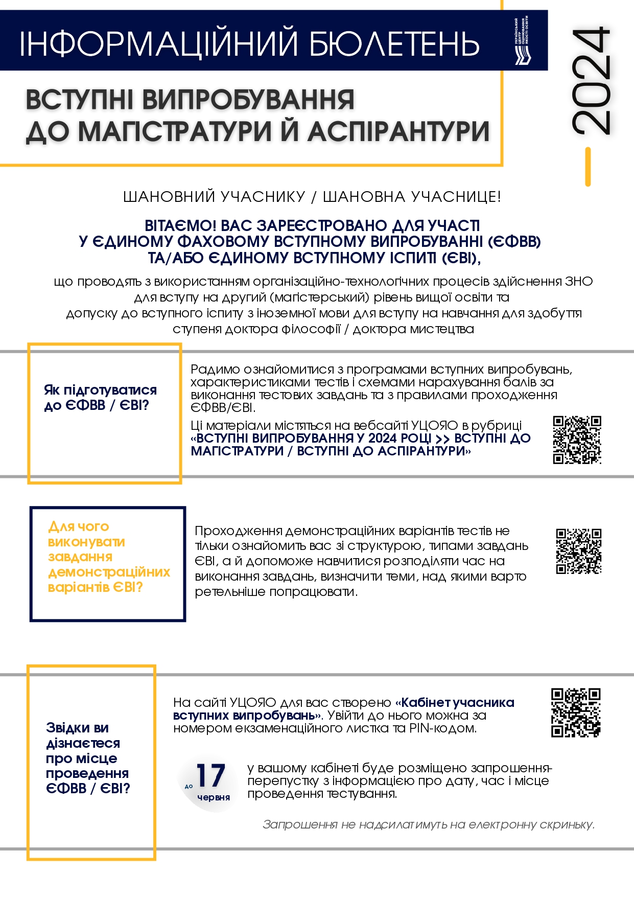 Реєстрація для проходження єдиного вступного іспиту (ЄВІ) та єдиного вступного випробування з методології наукових досліджень (ЄВВ) для вступу в аспірантуру триватиме з 02 до 23 травня 2025 року та з 16 по 17 червня (для участі у додатковій сесії).