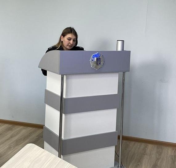 Курсантка 2 курсу факультету № 3 Карина Кордюкова захистила наукову роботу на тему «Молодь і громада: зміни заради національної безпеки України», науковий керівник – доцент кафедри поліцейської діяльності та публічного адміністрування факультету № 3, доктор юридичних наук, доцент Оксана Панова.
