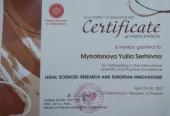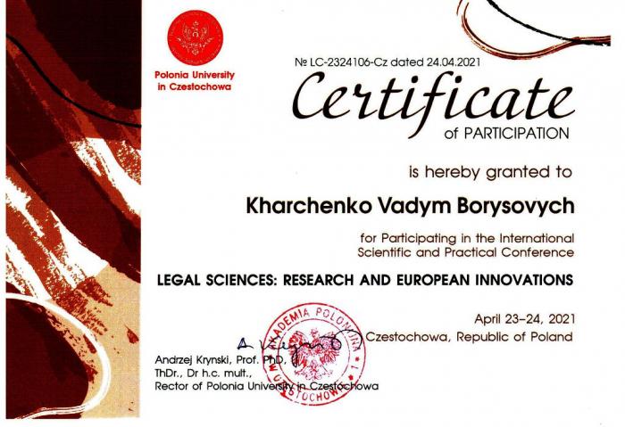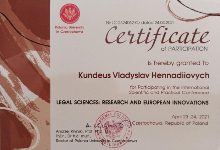 У міжнародній науково-практичній конференції «Юридичні науки: дослідження та міжнародні інновації» взяли участь онлайн завідувач кафедри кримінального права та кримінології факультету № 6 Вадим Харченко та науково-педагогічні працівники цієї ж кафедри, а саме: доценти кафедри Владислав Кундеус і Ірина Луценко та старший викладач кафедри Юлія Мітрофанова.