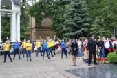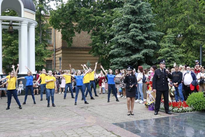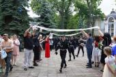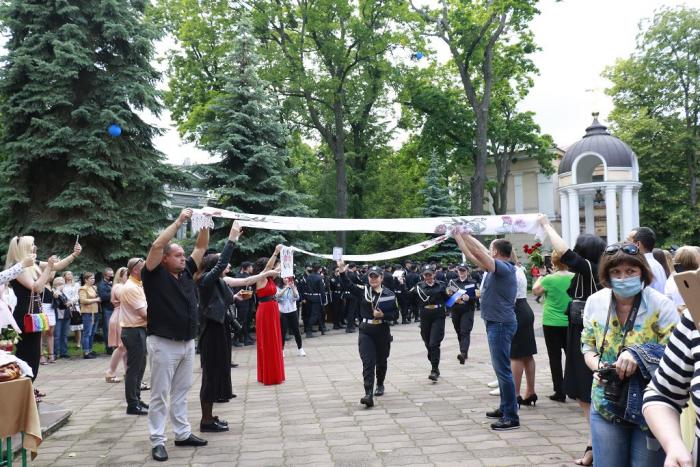 Юнаки та дівчата випустили в небо білих голубів на щастя і гарну долю та пройшли під вишитими українськими рушниками. Творчий подарунок для них підготували колектив художньої самодіяльності, духовий оркестр та курсантський підрозділ барабанщиць Харківського національного університету внутрішніх справ.