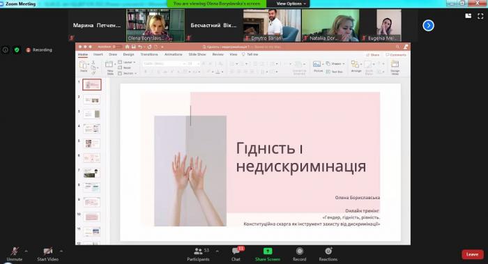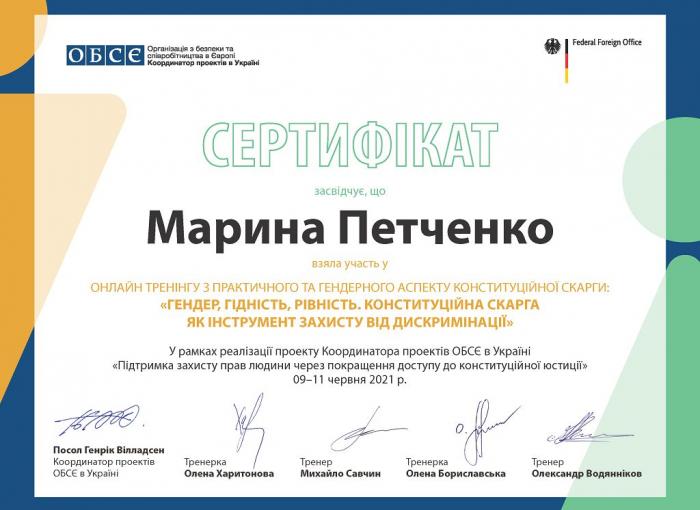 Відповідальна з гендерних питань у Кременчуцькому льотному коледжі Харківського національного університету внутрішніх справ кандидатка економічних наук Марина Петченко взяла участь в онлайн-тренінгу з практичного та гендерного аспекту конституційної скарги: «Гендер, гідність, рівність. Конституційна скарга як інструмент захисту від дискримінації». Захід був реалізований у рамках проєкту Координатора проєктів ОБСЄ в Україні «Підтримка захисту прав людини через покращення доступу до конституційної юстиції».