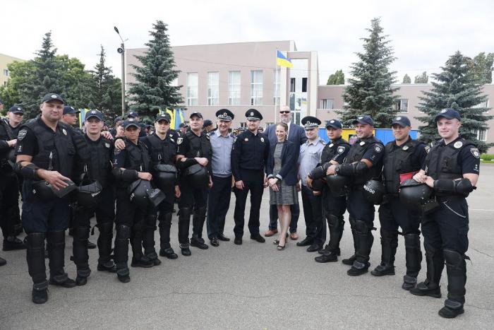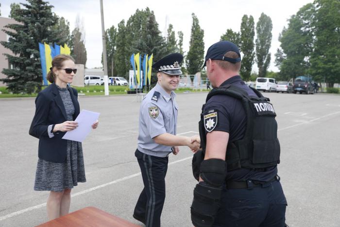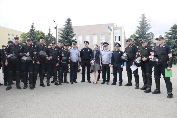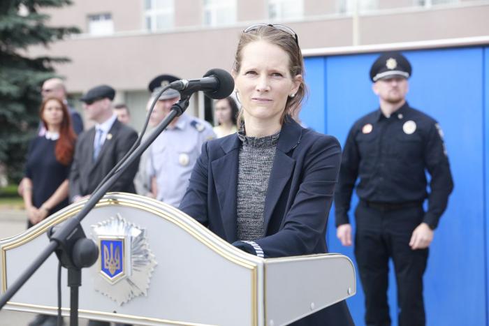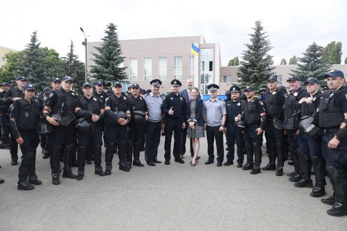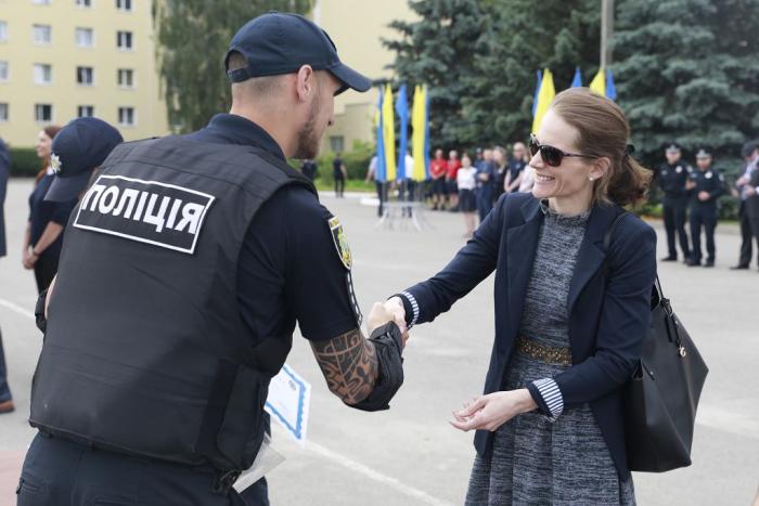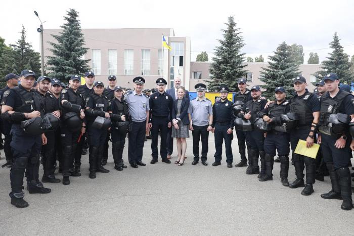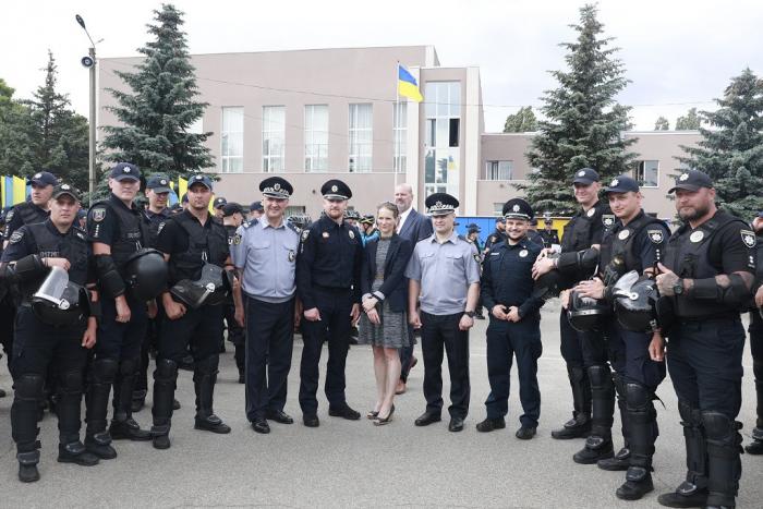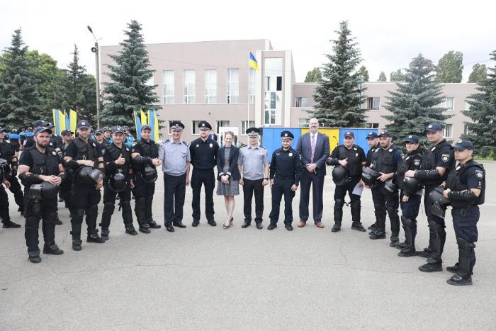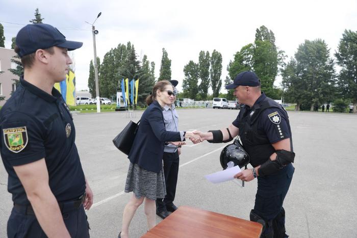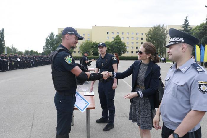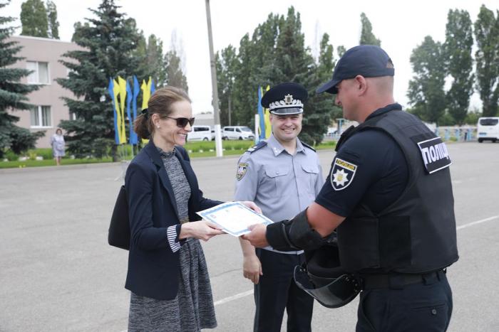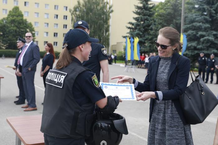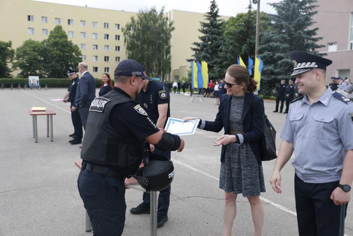 «Приємно брати участь у церемонії вручення сертифікатів, які ви заслужили, – наголосила керівник відділу з правоохоронних питань Посольства США в Україні Сара Лангенкамп. – Ви відіграєте важливу роль у дотриманні прав людей на мирні зібрання, під час яких вони можуть вільно спілкуватися, дотримуючись при цьому порядку. Ми запросили американських тренерів, які тісно з вами працювали увесь цей час. Я дякую усім вам, за те, що докладали усіх зусиль під час навчання й продемонстрували високий рівень співпраці між Україною та США».