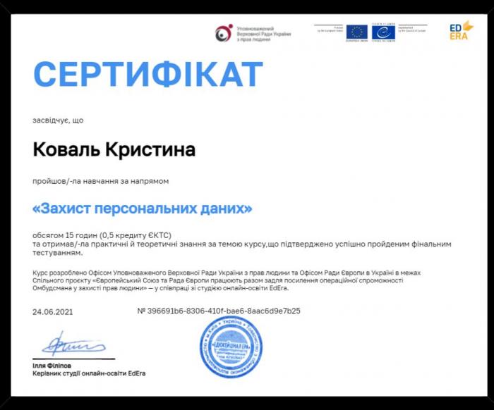 Курс «Захист персональних даних» розроблено Уповноваженим Верховної Ради України з прав людини та Офісом Ради Європи в Україні в рамках Спільного проєкту «Європейський Союз та Рада Європи працюють разом задля посилення операційної спроможності Офісу Омбудсмана у захисті прав людини» — у співпраці зі студією онлайн-освіти EdEra. У рамках курсу йшлося про персональні дані, хто і як може їх використовувати, що може очікувати людину, коли вона ставить «хрестик» біля згоди на обробку персональних даних, як заперечити проти обробки персональних даних та інші корисні поради, які допоможуть їх захистити.