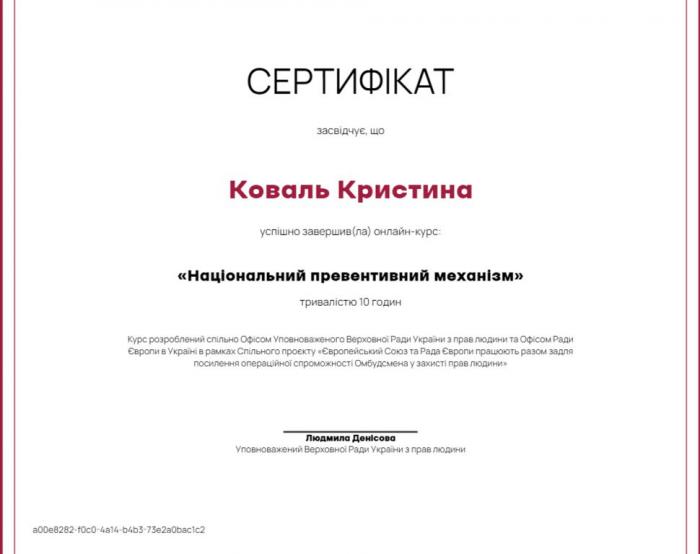 Онлайн-курс «Національний превентивний механізм» створений для всіх, хто прагне долучитися до захисту прав людини та запобігти їх порушенням у місцях несвободи. Курс розроблений у межах спільного проєкту Європейського Союзу та Ради Європи «ЄС та Рада Європи працюють разом задля посилення операційної спроможності Омбудсмана у захисті прав людини». Його учасники розглянули принципи роботи та практичні аспекти Національного превентивного механізму, також було визначено, які порушення виявляють монітори НПМ найчастіше у різних закладах, установах та службах, а саме у відділах поліції, пенітенціарних закладах, міграційній службі, соціальних закладах, психіатричних установах та військових закладах.