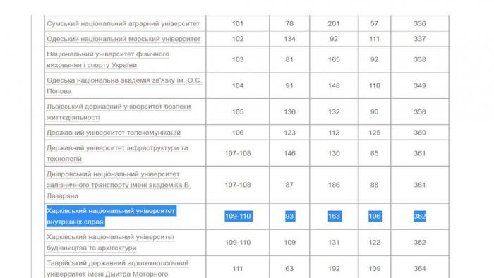 Консолідований рейтинг університетів–2021 охоплює результати 242 закладів вищої освіти. ХНУВС посів 109–110 місце, піднявшись у порівнянні з минулим роком на 44 сходинки. Він має найкращий результат серед ЗВО МВС, що готують поліцейських.