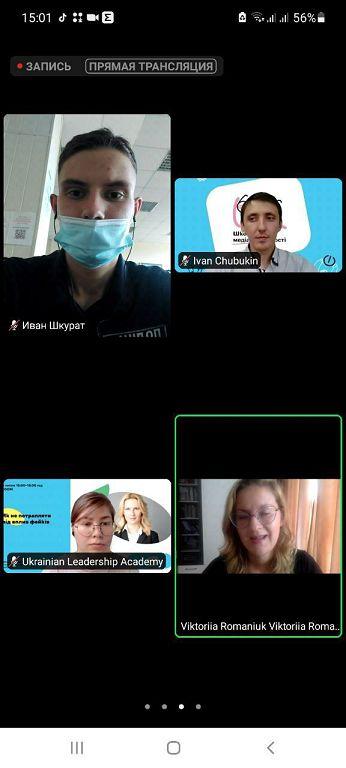 Учасники Школи наукового лідерства факультету № 1 Іван Шкурат, Юлія Шелест, Анна Софіч, Андрій Топчій, Платон Мозговий стали учасниками відкритої лекції «Як не потрапити під вплив фейків» від Української академії лідерства.