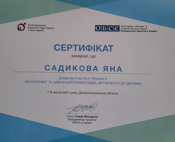 У м. Дніпро відбувся тренінг для представників громадськості та органів влади, присвячений моніторингу судових процесів та адвокації правосуддя дружнього до дитини. У заході взяла участь доцентка кафедри юридичних дисциплін Сумської філії ХНУВС Яна Садикова. Тренінг проводився Координатором проєктів ОБСЄ в Україні у межах проєкту «Зміцнення спроможності громадянського суспільства щодо моніторингу та адвокації правосуддя, дружнього до дитини, в Україні» у співпраці з Уповноваженим Верховної Ради України з прав людини.