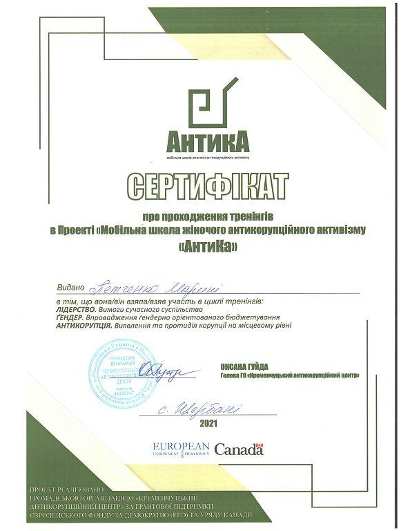 Представниця Кременчуцького льотного коледжу Харківського національного університету внутрішніх справ відповідальна з гендерних питань кандидатка економічних наук Марина Петченко взяла участь у циклі тренінгів: «Лідерство. Вимоги сучасного суспільства», «Гендер. Впровадження гендерно орієнтованого бюджетування», «Антикорупція. Виявлення та протидія корупції на місцевому рівні». Організатором заходів стала мобільна школа жіночого антикорупційного активізму «АнтиКа» ГО «Кременчуцький антикорупційний центр» за грантової підтримки Європейського фонду за демократію (ЄФД).