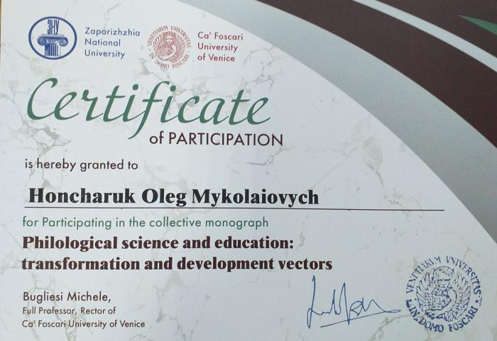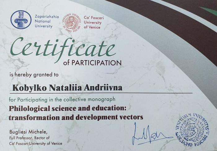 Науковці університету – старша викладачка кафедри соціально-гуманітарних дисциплін факультету № 6, кандидатка філологічних наук Наталія Кобилко і доцент кафедри іноземних мов факультету № 1, кандидат філологічних наук Олег Гончарук – долучилися до написання колективної монографії «Philological science and education: transformation and development vectors», що стала спільним проєктом Венеціанського університету Ка’ Фоскарі та Запорізького національного університету. Книга побачила світ у європейському видавництві «Izdevnieciba “Baltija Publishing”» (м. Рига, Латвія). Монографія присвячена актуальним питанням філологічних наук та об’єднала як українських, так і закордонних дослідників.