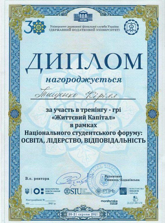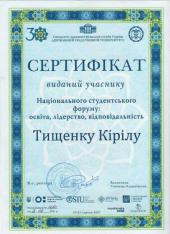 Учасник Школи наукового лідерства курсант 1 курсу факультету № 1 ХНУВС Кирило Тищенко взяв участь у Національному студентському форумі: освіта, лідерство, відповідальність, що проходив в Університеті державної фіскальної служби України у м. Ірпінь Київської області. Мета Форуму – формування спільноти проактивних та відповідальних лідерів студентського самоврядування, створення унікального середовища для плідної співпраці студентів із представниками університетів, влади та бізнесу.