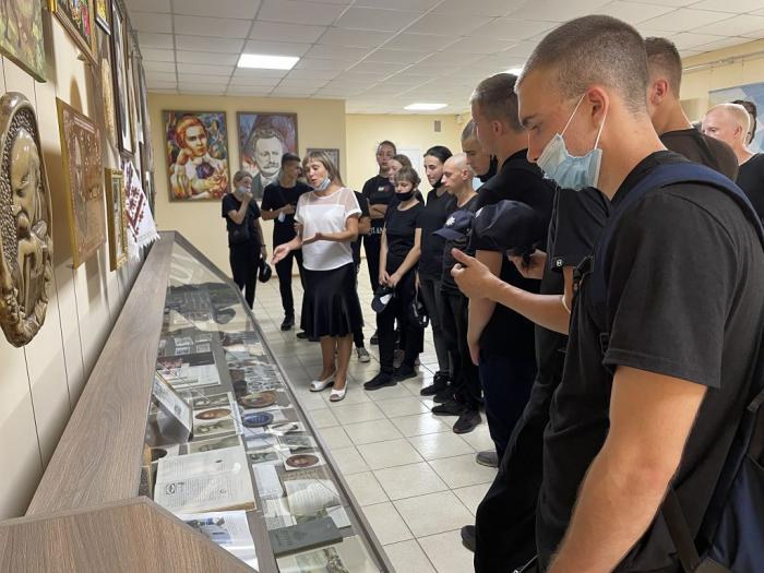 Відбулося знайомство майбутніх правоохоронців з експозиціями: «Шевченко – душа українського народу», «Леся Українка: доля, епоха, творчість», «Іван Франко – розум і серце нашого народу», де представлені портрети Кобзаря в різних стилях і техніках виконання, вітрини з експонатами щодо фактів біографій видатних письменників, монети, купюри, поштові конверти, марки й листівки, значки, керамічні та інші вироби ужиткового мистецтва.