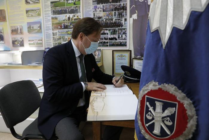 Валерій Сокуренко ознайомив Координатора проєктів ОБСЄ в Україні посла Генріка Вілладсена з особливостями поліцейського закладу вищої освіти. Він розповів про його структуру, досягнення та можливості. Валерій Васильович зазначив, що університет активно співпрацює з Координатором проєктів ОБСЄ в Україні та висловив сподівання, що співробітництво й надалі буде плідним.
