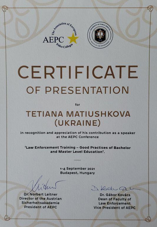 Під час виступу були розкриті питання, пов’язані з підготовкою майбутніх працівників поліції у закладах вищої освіти зі специфічними умовами навчання. Доповідачки зазначили, що сучасна підготовка працівників правоохоронних органів характеризується наступними ознаками: залученням до проведення бінарних занять працівників практичних підрозділів Національної поліції України, проведенням виїзних навчальних занять, використанням тренінгових підходів та кращих європейських практик під час навчального процесу та запровадженням квестів, використанням судових трансляцій під час занять з права, участю здобувачів вищої освіти та науково-педагогічного, наукового складу у ознайомчих візитах, програмах обмінів, навчальних курсах в поліцейських закладах освіти та підрозділах поліції зарубіжних країн, організацією вебінарів з науковцями країн-членів Європейського Союзу, впровадженням новітніх технік та практик попередження злочинності у навчальну діяльність (CustodyRecords, POLINA, підготовка поліцейських офіцерів громади тощо), використанням онлайн платформ для поліцейської освіти (наприклад, LEEd CEPOL), організацією та проведенням спільних наукових заходів (конференцій, семінарів, круглих столів тощо), тренуванням особового складу університету міжнародними експертами, модернізацією університетських бібліотек з метою отримання доступу до онлайн ресурсів закордонних країн, поєднанням очного та дистанційного навчання, психологічною підтримкою у проведенні занять тощо.