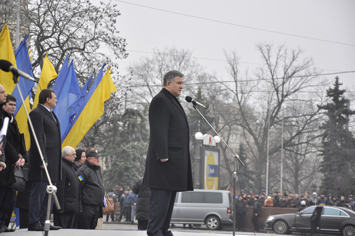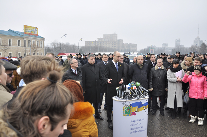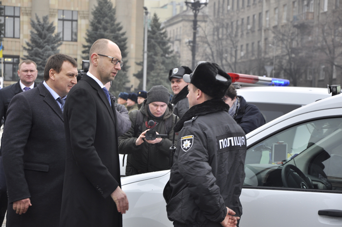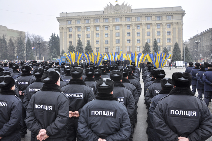 На площі Свободи у Харкові відбувся інструктаж особового складу груп швидкого реагування патрульної поліції Головного Управління Національної поліції України в Харківській області за участю Прем’єр-міністра України Арсенія Яценюка та Міністра внутрішніх справ України Арсена Авакова.