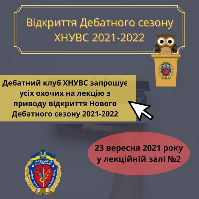23.09. 2021 року о 14:00 у приміщенні лекційної зали № 2 відбудеться відкриття Нового дебатного сезону 2021-2022 рр. і презентація Дебатного клубу ХНУВС. Спікер заходу – досвідчений дебатер, тренер Федерації Дебатів України, багаторазовий переможець Всеукраїнських і Міжнародних дебатних турнірів Дмитро Щербина.