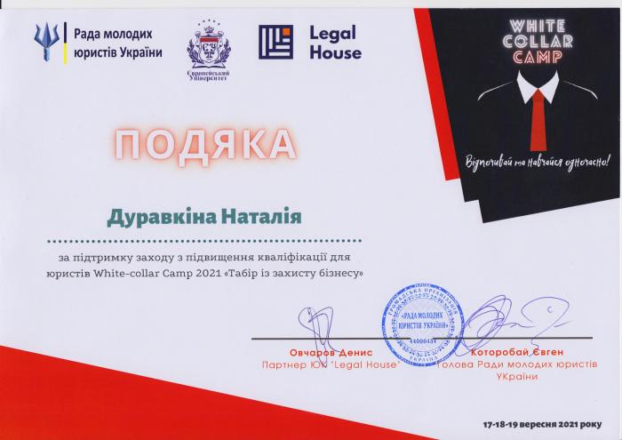 Доцент кафедри юридичних дисциплін Сумської філії Харківського національного університету внутрішніх справ Наталія Дуравкіна на запрошення Ради молодих юристів України спільно з юридичною клінікою «Legal House» взяла участь у проведенні табору із захисту бізнесу «White Сollar Camp 2021».