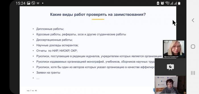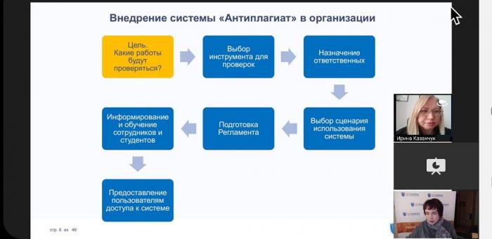 Доцентка кафедри адміністративного права та процесу факультету №1 полковник поліції Ірина Казанчук взяла участь у циклі навчальних вебінарів на актуальні теми: «Впровадження системи «Антиплагіат» в організації: 7 простих кроків», «Перевірка дипломних робіт в системі «Антиплагіат». Майстер-клас онлайн» та «Експертна оцінка оригінальності наукових робіт за допомогою системи «Антиплагіат». Спікерами навчального заходу стали керівниця навчально-методичного центру компанії «Антиплагіат» Ольга Бєлєнька, провідний спеціаліст цього ж навчально-методичного центру Ольга Філіппова, а також досвідчені тренери-науковці з різних країн світу.