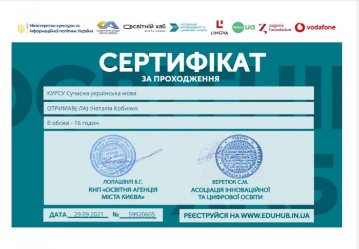Доцентка кафедри соціально-гуманітарних дисциплін факультету № 6 кандидатка філологічних наук Наталія Кобилко пройшла курс «Сучасна українська мова» від Освітнього хабу міста Києва. Курс створено на базі нової редакції «Українського правопису» 2019 року. Він охоплює три модулі: «Мова та мовлення», «Правопис», «Ділова українська мова». Мета курсу – нагадати основи мови, зокрема букви і звуки, орфографію, пунктуацію та основні зміни, передбачені «Українським правописом». Авторки проєкту Олена Даниліна та Ірина Рудика особливу увагу звернули на важливі орфограми, варіативне написання слів, творення та функціонування фемінітивів у діловому мовленні, особливості документації залежно від професії. Теоретичний матеріал подано у вигляді реплік головних героїв, які чергуються з практичними завданнями для учасників навчання. Викладачки курсу впевнені, що досконале володіння українською мовою – це ознака стилю та престижу.