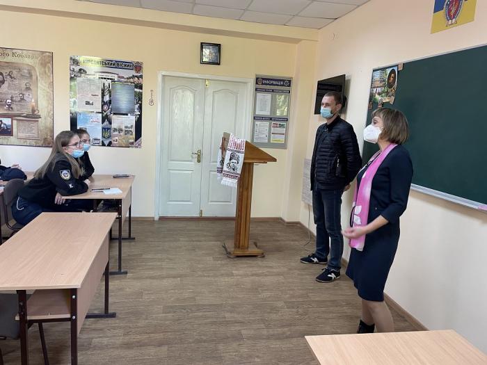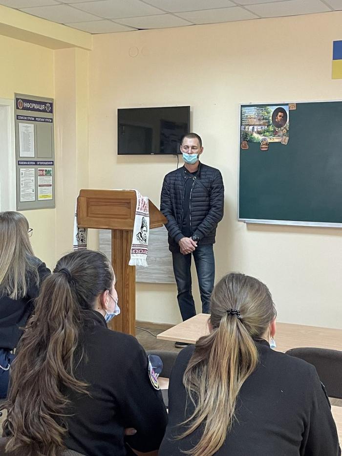 До Дня захисників і захисниць України викладачі кафедри українознавства факультету № 2 провели для курсантів своїх кураторських груп зустріч із бійцем АТО/ООС Віталієм Романенком. Воїн поділився своїми спогадами, як у 2015 році став добровольцем й дотепер бере участь в операції об’єднаних сил на сході України, що його спонукало до прийняття такого рішення. Віталій Романенко розповів про досвід, який отримав під час служби, а головним своїм здобутком назвав вміння цінувати життя та справжніх вірних друзів, зауваживши, що війна змінює світогляд, змушує по-іншому оцінювати ті проблеми, які супроводжують людину у мирному житті.