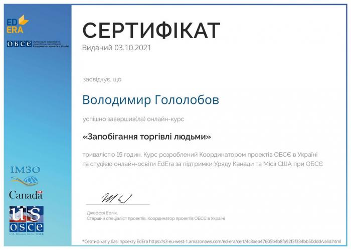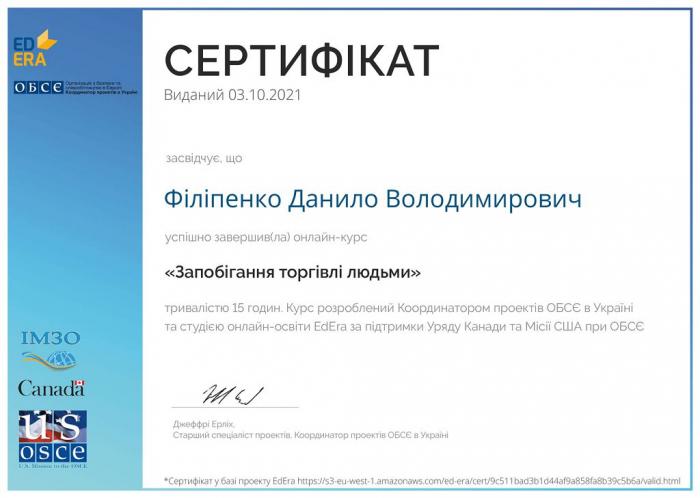 Навчальна група курсантів факультету № 2 на чолі з куратором групи викладачем кафедри тактичної та спеціальної фізичної підготовки факультету № 3 Харківського національного університету внутрішніх справ Олександром Скляром у рамках підвищення рівня знань та професійної компетентності успішно пройшли онлайн-курс «Запобігання торгівлі людьми в Україні».