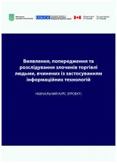 Навчальний курс містить основні відомості, необхідні для виявлення, попередження та розслідування злочинів у сфері торгівлі людьми, вчинених із застосуванням інформаційних технологій. Курс призначено для оперативних працівників підрозділів боротьби зі злочинами, пов’язаними з торгівлею людьми, та працівників кіберполіції. Також він буде корисним для інших фахівців системи кримінальної юстиції, зокрема слідчих, прокурорів і суддів, а також курсантів ВНЗ МВС України, які навчаються за спеціалізаціями «протидія торгівлі людьми» та «протидія кіберзлочинності».