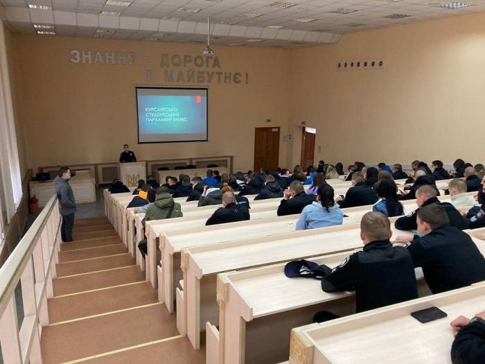 Голова курсантсько-студентського парламенту рядовий поліції Олександр Бабич провів зустріч із курсантами 1-4 курсів факультету № 4 Харківського національного університету внутрішніх справ.