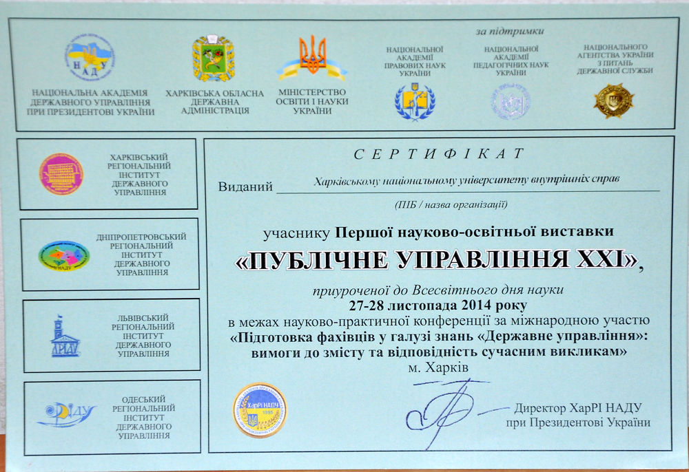 Харківський національний університет внутрішніх справ став учасником Першої щорічної науково-освітньої виставки «Публічне управління XXІ», приуроченої до Всесвітнього дня науки. Виставку було організовано на базі Харківського регіонального інституту державного управління Національної академії державного управління при Президентові України.