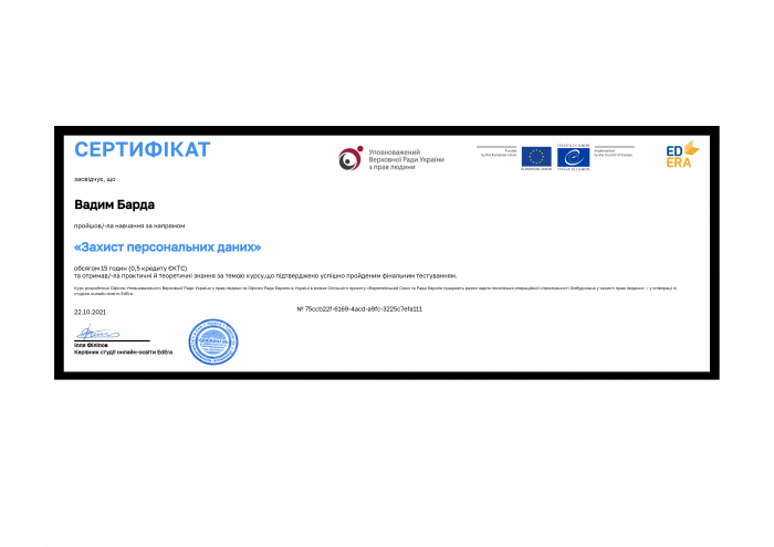 Учасник Школи наукового лідерства курсант 1 курсу факультету № 1 Харківського національного університету внутрішніх справ Вадим Барда пройшов онлайн-курс на платформі онлайн-освіти «Educational Era». Тема онлайн-курсу – «Захист персональних даних». Було розглянуто, що таке персональні дані, хто їх може використовувати та як правильно їх захистити. В основі курсу – критично важлива інформація для людини у час інноваційних технологій. Курсант дізнався практичні методи, що дозволяють зберегти персональні дані, а також цікаві факти про діджиталізацію в Україні.