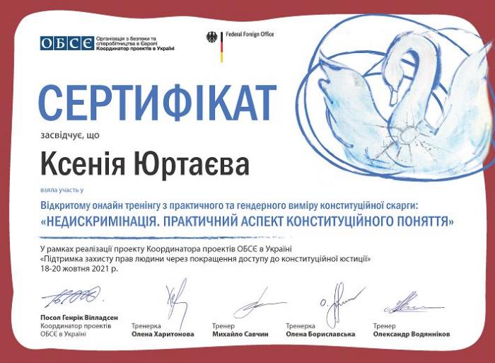 Доцент кафедри кримінального права і кримінології факультету № 1 Харківського національного університету внутрішніх справ Ксенія Юртаєва взяла участь в триденному онлайн-тренінгу з практичного та гендерного виміру конституційної скарги «Недискримінація. Практичний аспект конституційного поняття» в рамках реалізації проєкту Координатора проєктів ОБСЄ в Україні «Підтримка захисту прав людини через покращення доступу до конституційної юстиції».