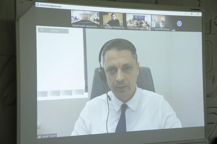 Йозеф Гюлай наголосив, що Консультативна місія Європейського Союзу багато років плідно співпрацює і з Міністерством внутрішніх справ України, і з Харківським національним університетом внутрішніх справ. Він розповів про спільні антикорупційні проєкти, які тривають наразі та плануються найближчим, і побажав учасникам круглого столу плідної роботи.
