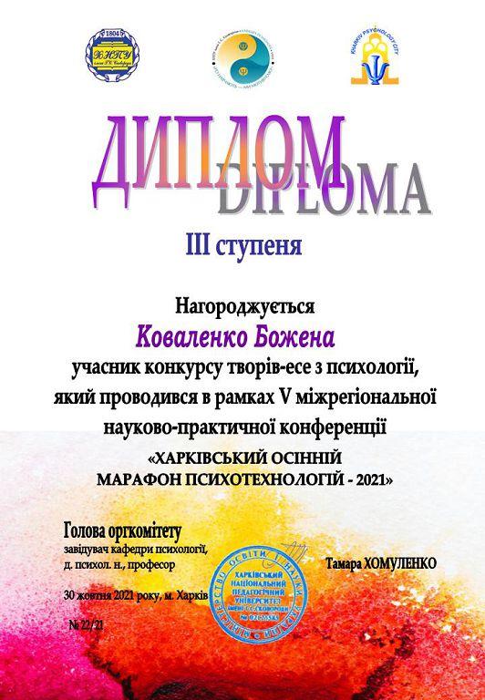 Есе курсантки Божени Коваленко «Шляхи звільнення від невпевненості» відзначено Дипломом ІІІ ступеня, наукова керівниця – доцентка кафедри педагогіки та психології Вікторія Доценко.