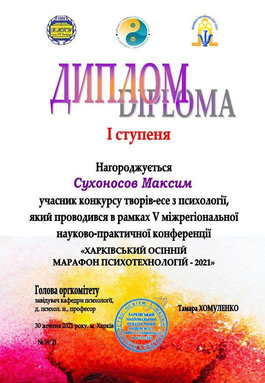 Есе курсанта Максима Сухоносова «За і проти Інтернету у психологічному житті сучасної людини» відзначено Дипломом І ступеня, наукова керівниця – доцентка кафедри педагогіки та психології Вікторія Доценко.