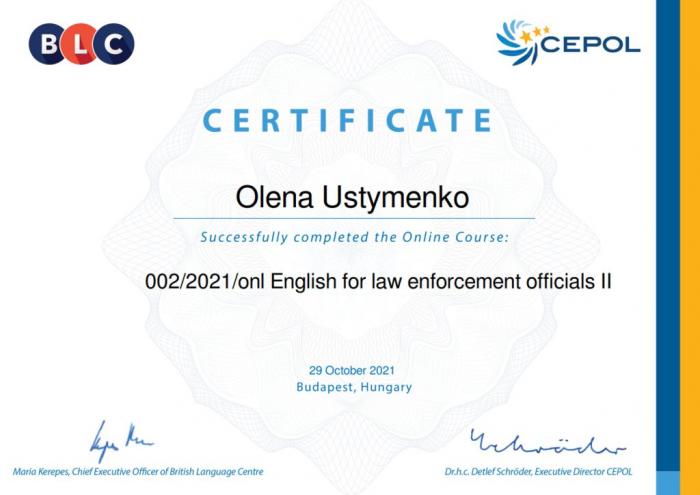 Представниці Харківського національного університету внутрішніх справ: начальниця відділу міжнародного співробітництва Олена Устименко та ад’юнкт відділу організації освітньо-наукової підготовки Анастасія Вуйма пройшли курс «English for law enforcement officials II» на освітній онлайн-платформі LEEd CEPOL.
