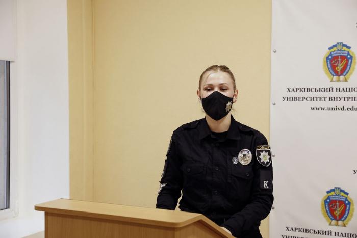 Від імені курсантів Дніпропетровського державного університету внутрішніх справ Аліна Лукомська подякувала ректору, колективу Харківського національного університету внутрішніх справ за гостинність, знання, які вони отримують в межах цієї програми, за можливість поспілкуватися зі своїми однолітками, обмінятися з ними досвідом навчання й отримати нові позитивні емоції.