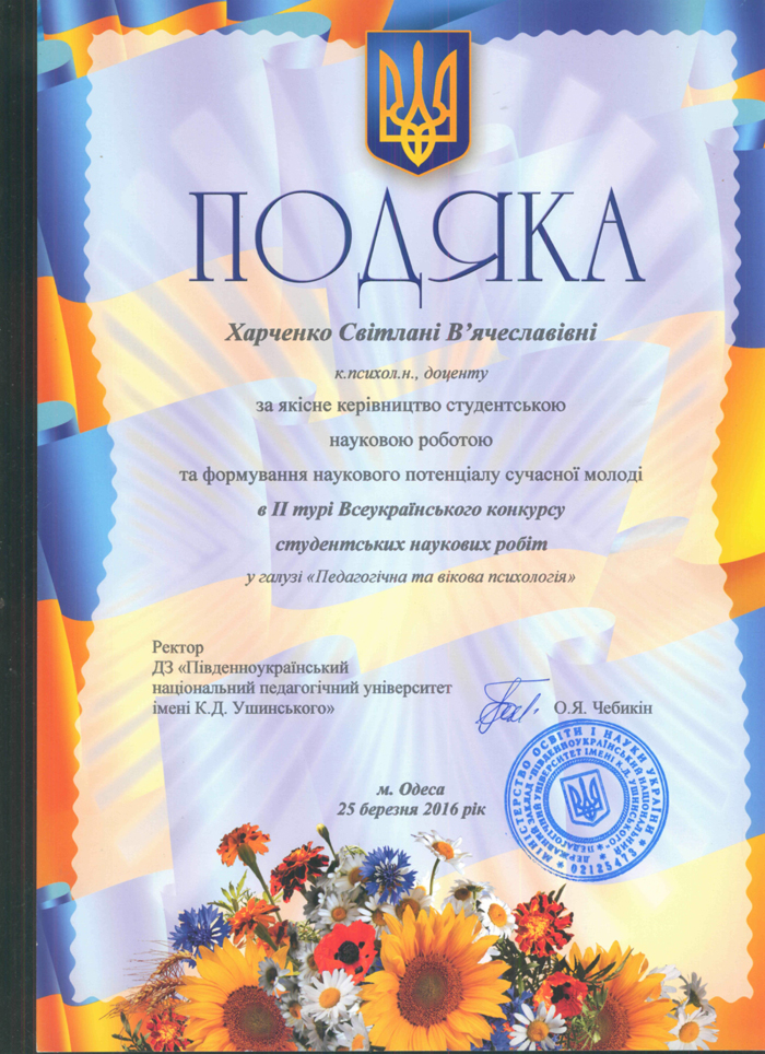Наукова робота курсанта 3 курсу факультету № 3 Харківського національного університету внутрішніх справ Юлії Cавчук взяла участь у ІІ турі Всеукраїнського конкурсу студентських наукових робіт з природничих, технічних та гуманітарних наук (педагогічна та вікова психологія) у 2015/2016 навчальному році. Конкурс проходив у Південноукраїнському національному педагогічному університеті імені К. Д. Ушинського. У ньому взяли участь 150 наукових робіт студентів і курсантів з усієї України.