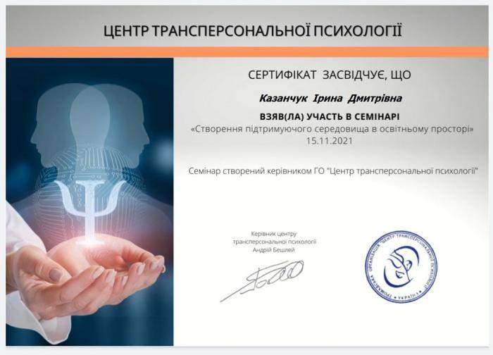 Доцентка кафедри адміністративного права та процесу факультету № 1 полковник поліції Ірина Казанчук взяла участь в онлайн-семінарі «Створення підтримуючого середовища в освітньому просторі», організованого ГО «Центр Трансперсональної психології» за інформаційної підтримки Львівського національного університету імені Івана Франка.