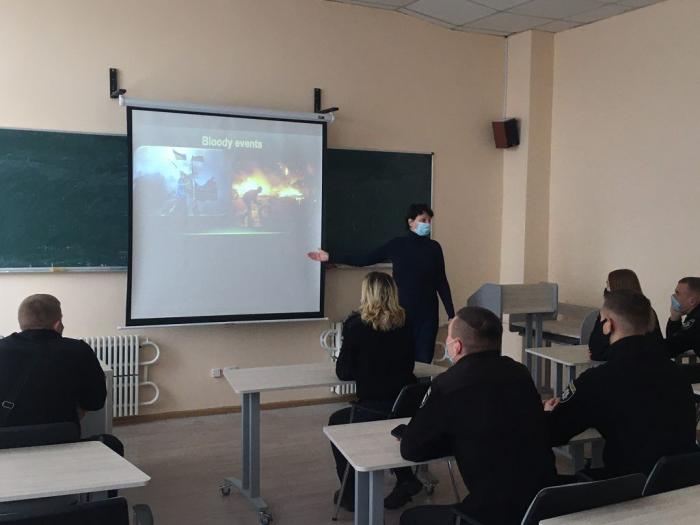 Курсанти подивилися презентацію англійською мовою «Хронологія подій 2014 року. Як це було?», обговорили головні причини протестів громадян, криваві зіткнення з людськими жертвами та висловилися на підтримку Європейського курсу України.