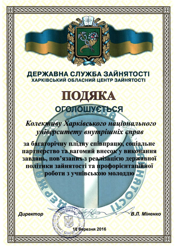 За багаторічну плідну співпрацю, соціальне партнерство та вагомий внесок у виконання завдань, пов’язаних із реалізацією державної політики зайнятості та профорієнтаційної роботи з учнівською молоддю, колектив університету отримав подяку від Харківського обласного центру зайнятості.