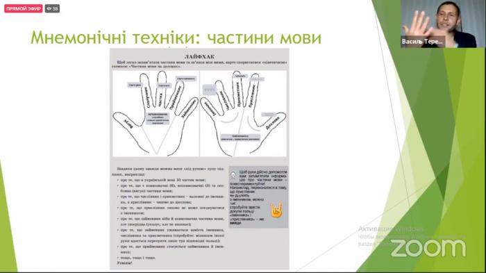 Під час заняття доцентка ознайомилася з особливостями пропонованого посібника, головна увага була зосереджена на теорії, практиці, методичності та енциклопедичності. Книга містить як теоретичний матеріал з новими методиками для запам’ятовування та полегшення сприймання учнями, так і тести, тренувальні вправи та онлайнові додатки (посилання на словники, правопис, таблиці, схеми).
