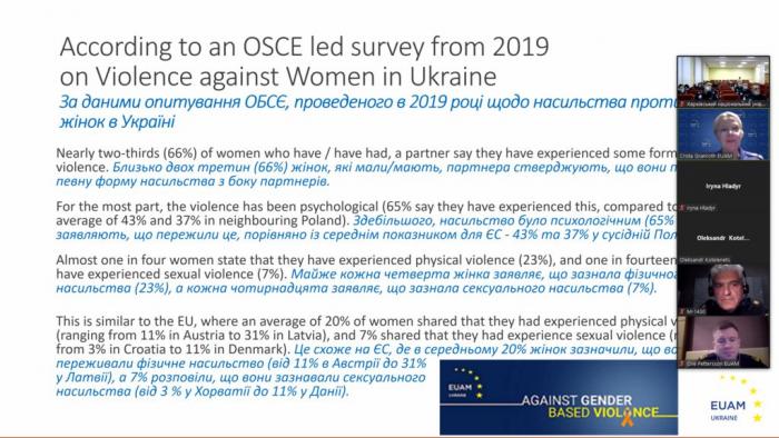 Метою лекції було привернення уваги до проблем гендерно-зумовленого насильства та насильства в цілому. Представники КМЄС розповіли про досвід та підходи своїх країн – Фінляндії, Швеції та Нідерландів щодо запобігання насильству та розповіли про стратегії подолання цього явища. Крім того, спікери звернули увагу учасників на вплив пандемії Covid-19 на ситуацію в країнах Європейського Союзу та розповіли про програми запобігання та протидії домашньому насильству у власних країнах. Учасники заходу брали активну участь у обговореннях, під час яких спікери відповіли на всі їхні запитання.