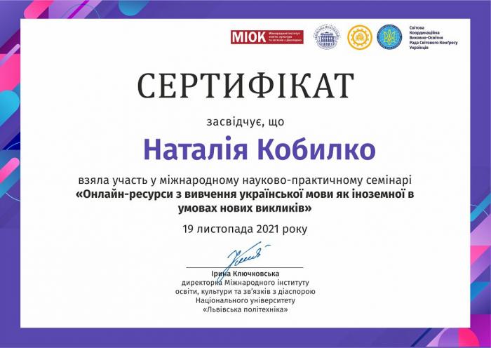 Доцентка кафедри соціально-гуманітарних дисциплін факультету № 6 кандидатка філологічних наук Наталія Кобилко взяла участь у Міжнародному науково-практичному семінарі «Онлайн-ресурси з вивчення української мови як іноземної в умовах нових викликів», організованого Міжнародним інститутом освіти, культури та зв’язків з діаспорою. Захід відбувся на платформі Zoom та об’єднав 130 учасників з понад 20 країн світу. МІОК презентував технічні можливості на порталі «Український освітній всесвіт 2.0» для покращення комунікації, обміну ідеями та методичними розробками між педагогами як з України, так і з-за кордону.