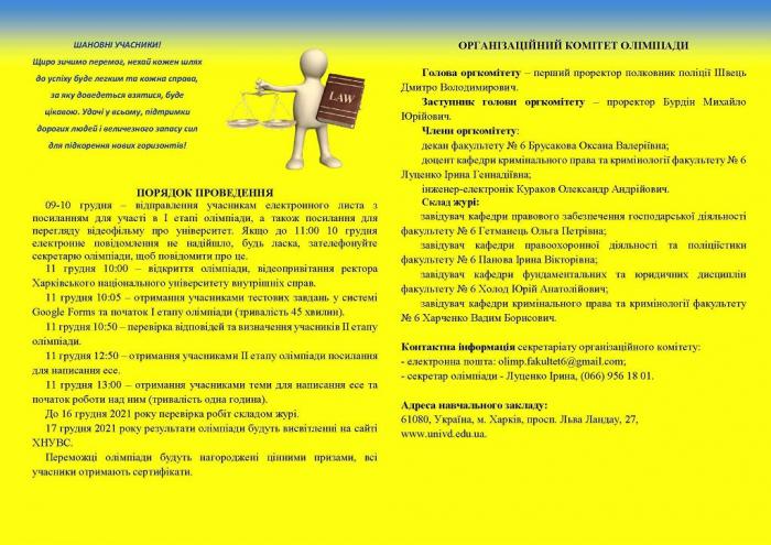 11 грудня 2021 року о 10.00 Харківський національний університет внутрішніх справ запрошує учнів 10–11 класів загальноосвітніх шкіл І–ІІІ ступенів міста Харкова та Харківської області, а також студентів І–ІІ курсів закладів вищої освіти І та ІІ рівнів акредитації в дистанційному режимі взяти участь в олімпіаді «Юний правознавець».