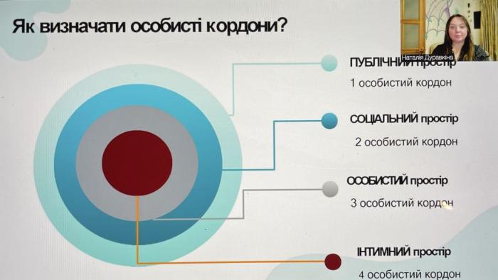 Лекторка розповіла учням, як сформувати поняття цінності їхнього життя, що таке особисті кордони, ознайомила з правилами безпеки кожного кордону – публічного, соціального, особистого, інтимного простору. Також навчила старшокласників розрізняти небезпечні життєві ситуації та як застосовувати правила безпеки, захищаючи своє життя.