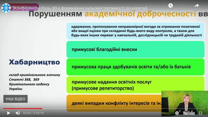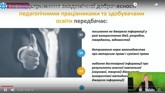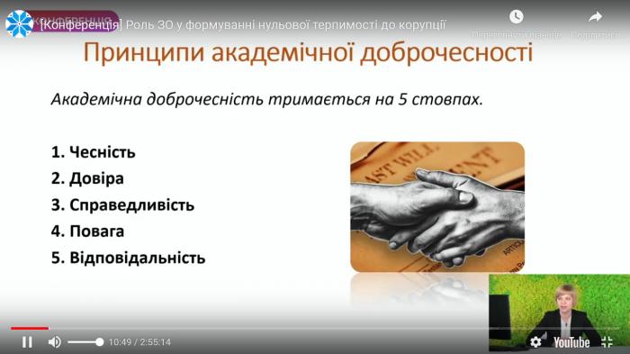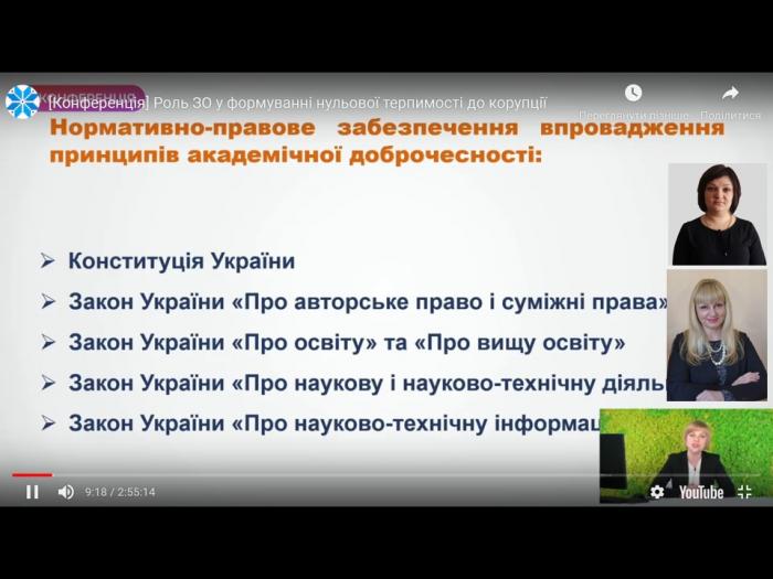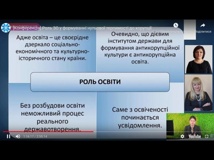 Під час заходу обговорювалися питання: формування культури академічної доброчесності в освітніх закладах; захист прав викривачів як засіб формування нульової терпимості до корупції; лобіювання інтересів та корупція; як запобігати корупції через навчання і дослідження.