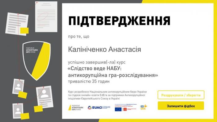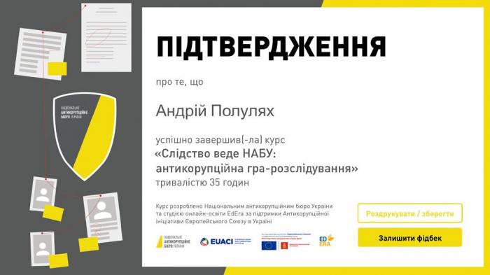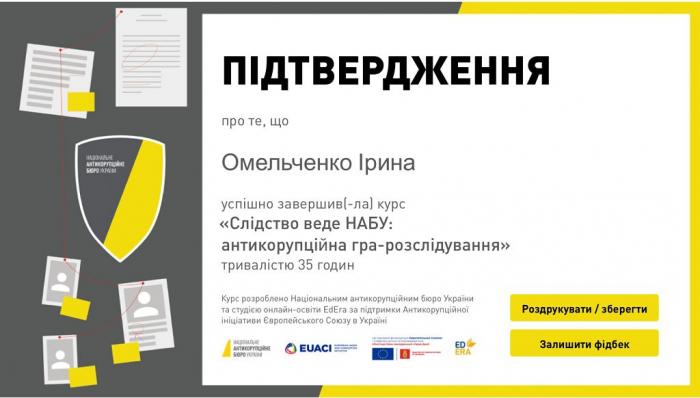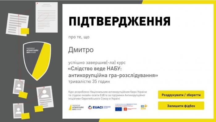 Інтерактивний формат та унікальні матеріали курсу допомогли підвищити знання та навики у викритті незаконних дій чиновників. На кожному етапі гри є відео з порадами від експертів.